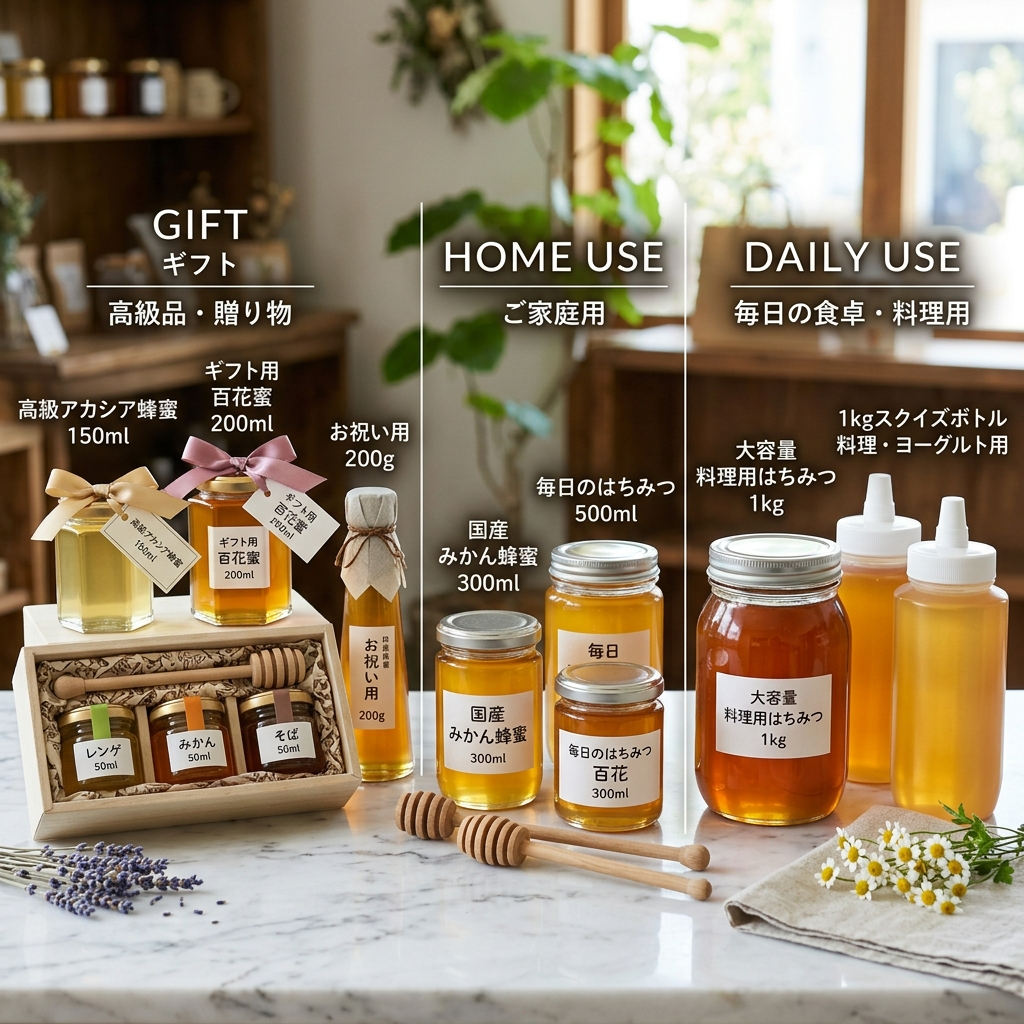 はちみつを選ぶ際は、どのような目的で使うのかを明確にすることが大切です。 贈り物にするなら、見た目にも美しい小瓶のセットやデザイン性の高いパッケージの商品が適しています。 一方で、毎日の料理やヨーグルトなどにたっぷり使いたい場合は、1kg以上の大容量ボトルを選ぶとコストパフォーマンスに優れます。 容器も、スプーンですくいやすい広口瓶や、液だれしにくいボトルなど、使い勝手を考慮して選びましょう。