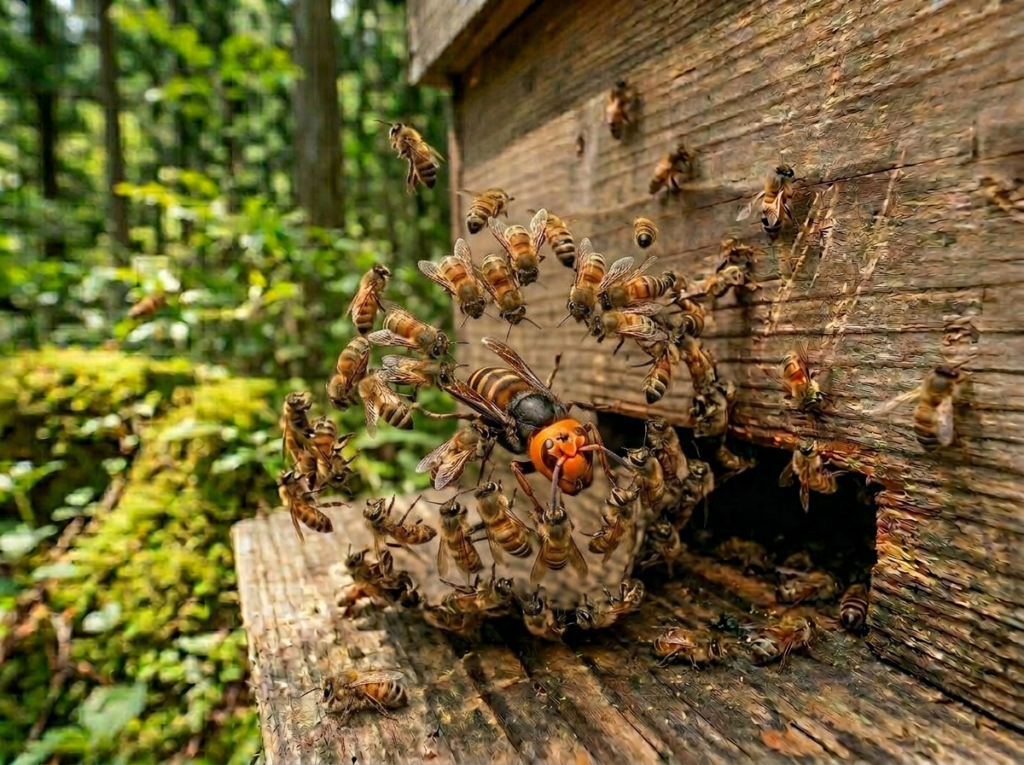 ニホンミツバチの生態で最も特徴的なのが、天敵であるスズメバチ、特にオオスズメバチやキイロスズメバチを撃退する熱殺蜂球です。