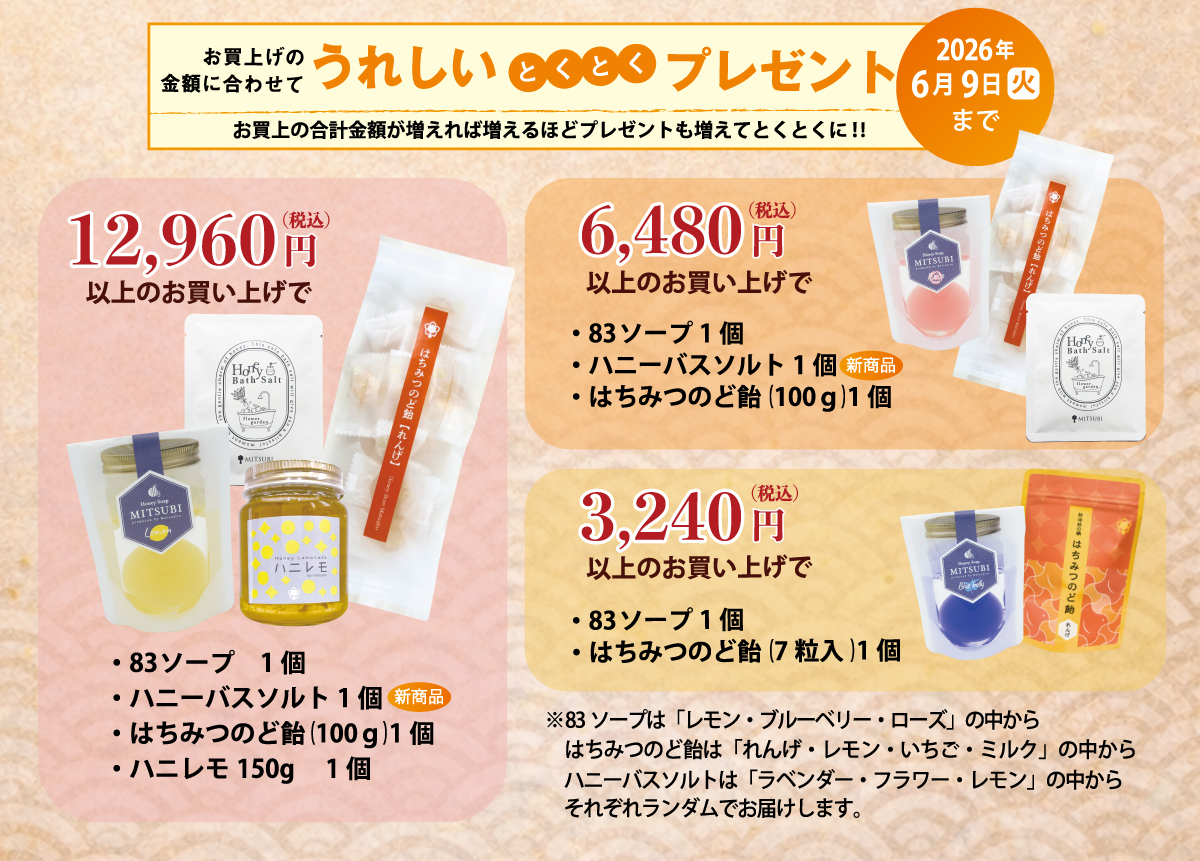 お買い上げの金額にあわせて、お買い上げの合計金額が増えればふえるほどプレゼントも増えてとくとくに!